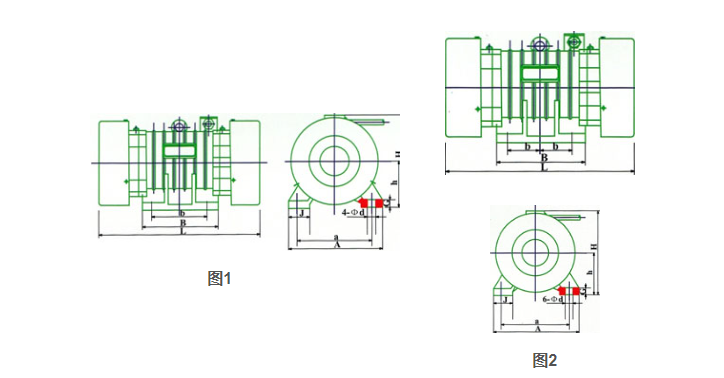 | 型號(hào) | 激振力 KN | 額定功率 KW | 額定電流 A | 振動(dòng)次數(shù) 次/分 | 安裝型式 | L | B | b | A | a | h | H | G | J | d | 圖 |